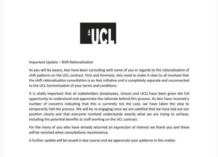 Nuestrxs representantes de seguridad en la UCL se han reunido periódicamente y han preparado el terreno para nuevas campañas durante el próximo curso académico, incluida la coordinación con el personal de limpieza para presionar para que todxs lxs trabajadorxs subcontratadxs se incorporen a la empresa. Además, han conseguido que lxs estudiantes apoyen los objetivos de nuestro sindicato de mejorar las condiciones de trabajo en la empresa. Después de varias reuniones que nuestrxs representantes de seguridad de la UCL han tenido con la dirección de Bidvest Noonan a principios de este mes sobre el tema, también seguimos construyendo nuestro caso de tribunal colectivo contra Bidvest Noonan por el robo de las vacaciones de lxs trabajadorxs de seguridad. A menos que Bidvest Noonan haga lo correcto y devuelva estas vacaciones, nos estamos preparando para luchar por ello tanto dentro como fuera de los tribunales.