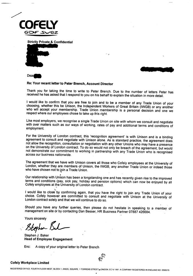 You have recently responded to letters written by your employees requesting that Cofely recognise the Independent Workers’ Union of Great Britain (IWGB) on the University of London contract (https://iwgb-universityoflondon.org/wp-content/uploads/2014/03/letter.jpg). The IWGB represents the majority of workers on the University of London contract. In your letter you explain why Cofely will continue to recognise UNISON, the main reason being that the current recognition supposedly does not allow you to recognise or engage with any other union. Having read your letter a couple times, I can’t help but wonder if you have even read the UNISON Recognition Agreement? On the off chance you haven’t, or perhaps if you have gotten it confused with a different recognition agreement, you can read it here: https://docs.google.com/file/d/0B5bXblPVqizeUy1lVjkyWTdUZjQ/edit.