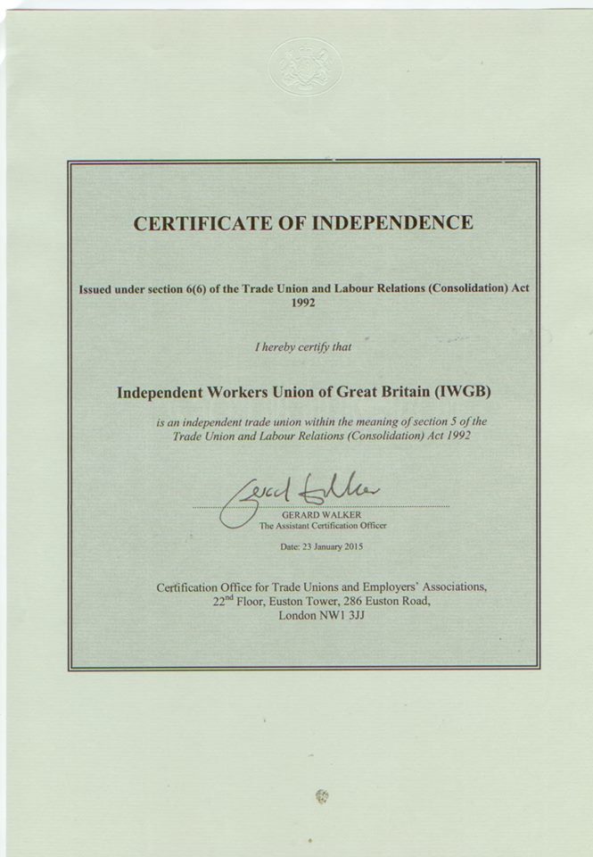 After what seemed like an age of bureaucratic procrastination, the IWGB has finally been issued with its Certificate of Independence by the Certification Officer. For any doubters – it’s in black and white on the gov.uk website.