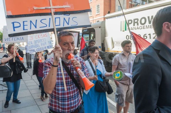 The demonstration kicked off at around 1.30pm outside the Royal College of Music on the 10th July 2015, with Alberto Durango, General Secretary of the IWGB, and Dr Jason Moyer-Lee, President of the union, kicking things off to a raucous start. The protest was held on the college’s graduation day, and shouts of ‘sick pay, holiday, pensions now!’ echoed over the front steps as the soon-to-be graduates arrived.
