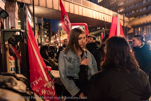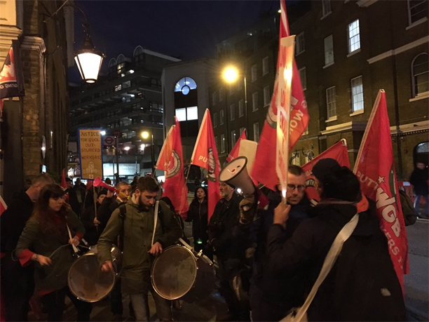 The noisy protest on 6 March came as Sir Adrian waited to welcome his guests at the Brewery near London’s Barbican Centre. Workers and their supporters started their march from Barbican station and at the venue, watched by the police and security staff, made their voices heard while handing out flyers to those attending the dinner.