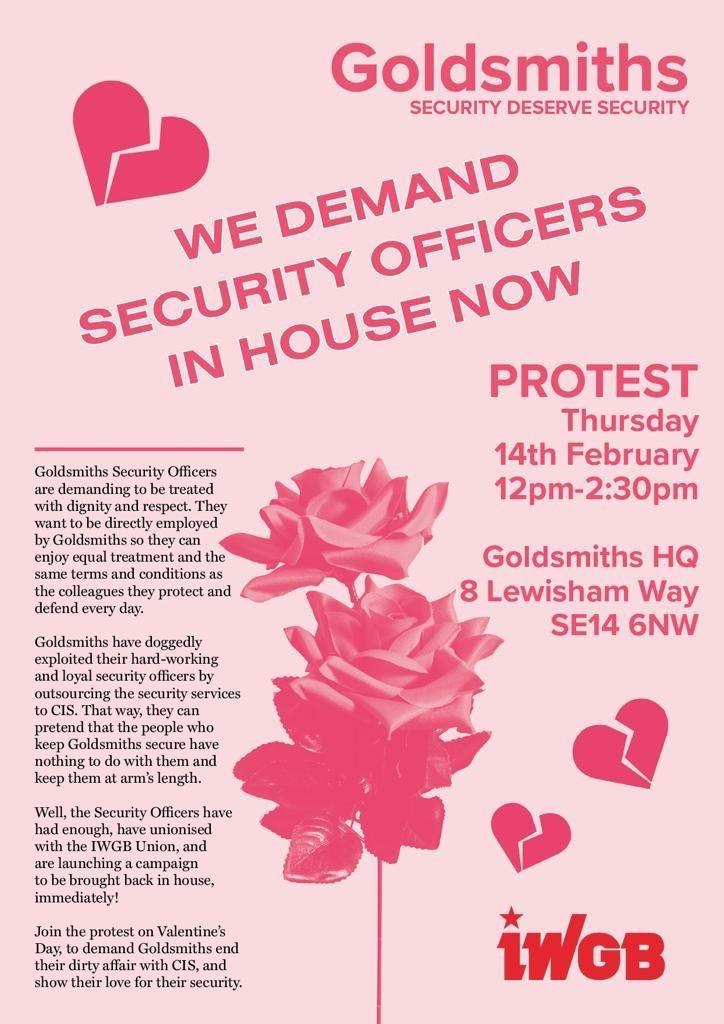 They want to be treated with dignity and respect, and are taking action over inadequate holiday pay, sick pay and derisory pensions by launching a campaign to be brought back in house immediately. As part of this campaign, they are holding a protest on Valentine’s Day at Goldsmiths HQ, 8 Lewisham Way, London SE14 6NW, 12–2.30pm.