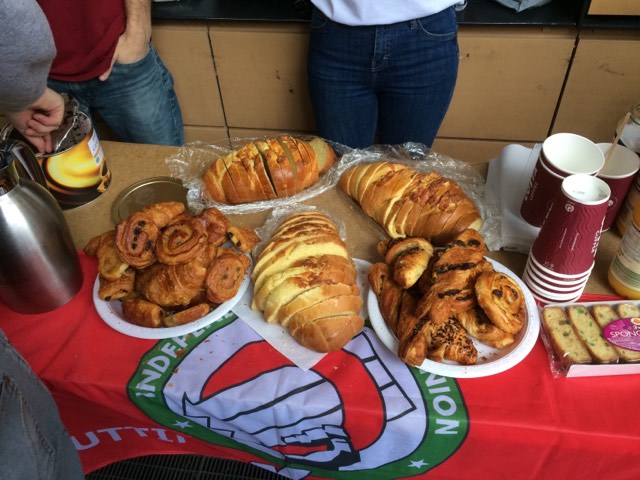 This morning students and IWGB reps at UCL held their weekly breakfast stall outside the Roberts engineering building at the UCL main campus. In addition to the usual spread of croissants and pastries, IWGB member Jose brought three fresh loaves of delicious Colombian bread which were extremely popular. 🥖🥖🥖 ☕️☕️