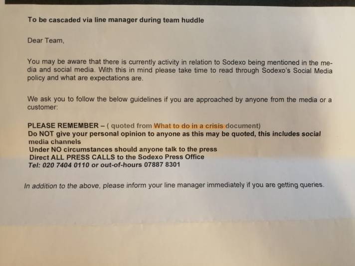 “I know it might be tempting when reading this to try and prove your worth to UCL by reacting in some way towards the workers. Let me take this opportunity to tell you that’s not a good idea.”It seems unfortunately my advice as not been followed as the attached document was handed out to cleaners, porters, etc. As you can see, and not for the first time, Sodexo management is a little confused as the document is clearly meant to be instructions for them on what to say to staff and not a document to be handed directly to staff. Or, in the terminology of Sodexo, the message was meant “to be cascaded via line manager during team huddle”. But as you and the general public will become more and more aware of over the coming months, this sort of incompetence is par for the course with cowboy contractors.