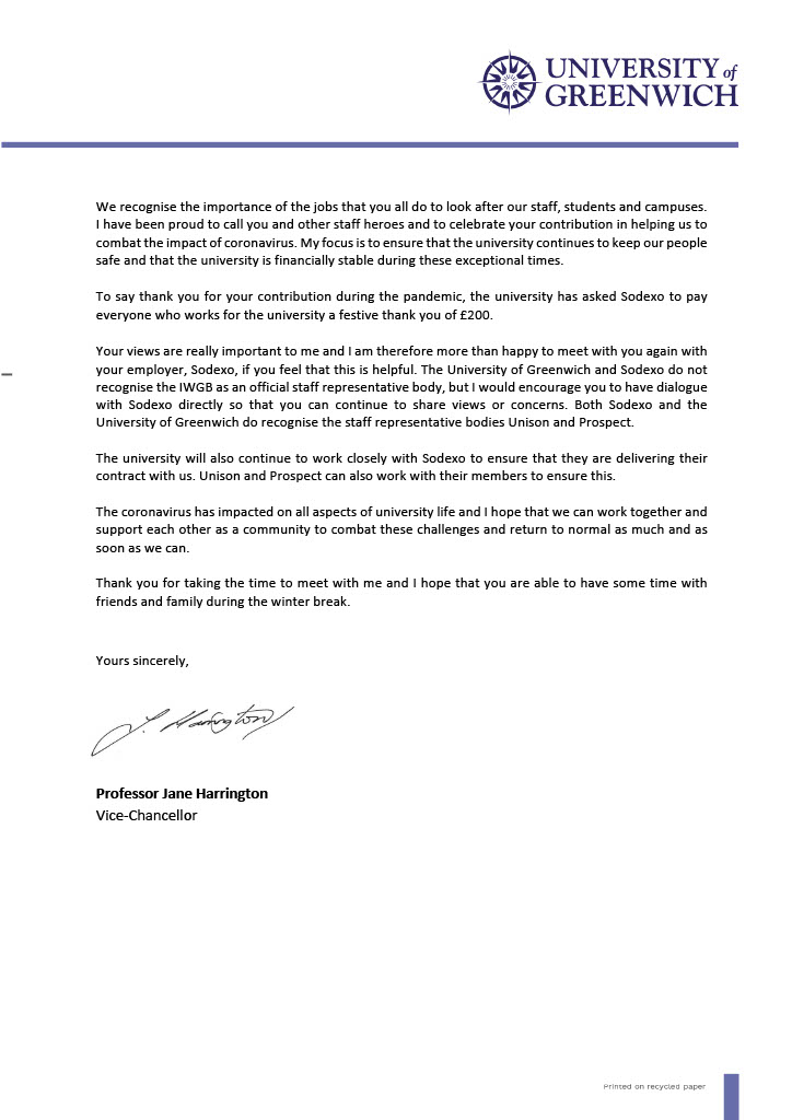 On 15 December, University of Greenwich Vice Chancellor wrote individually to all security staff at UoG, following a series of visits she had made to meet staff individually.