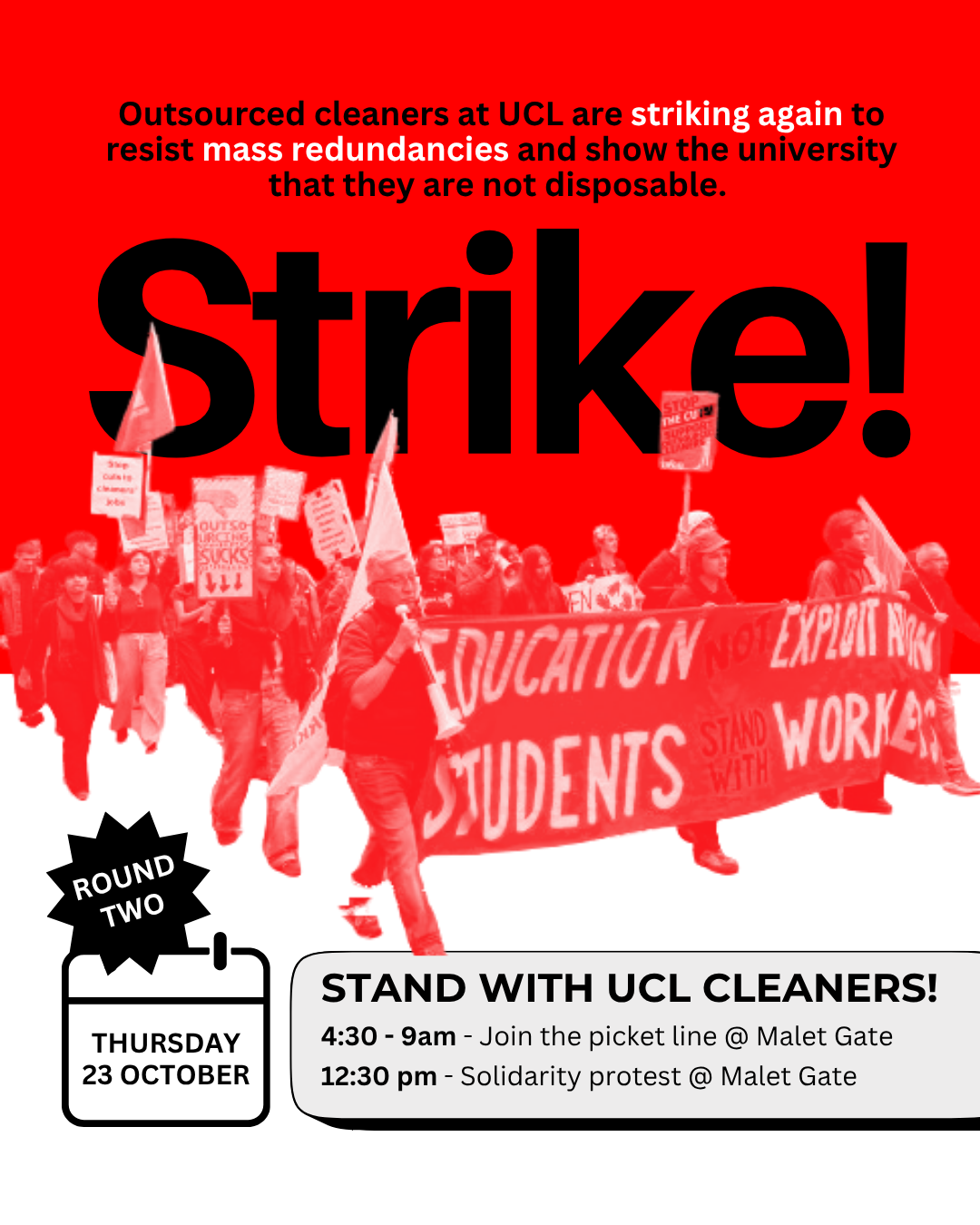 - Join the solidarity protest! Make some noise with cleaners, students, staff and neighbours as we demand that UCL stops the cuts and puts an end to outsourcing on campus.