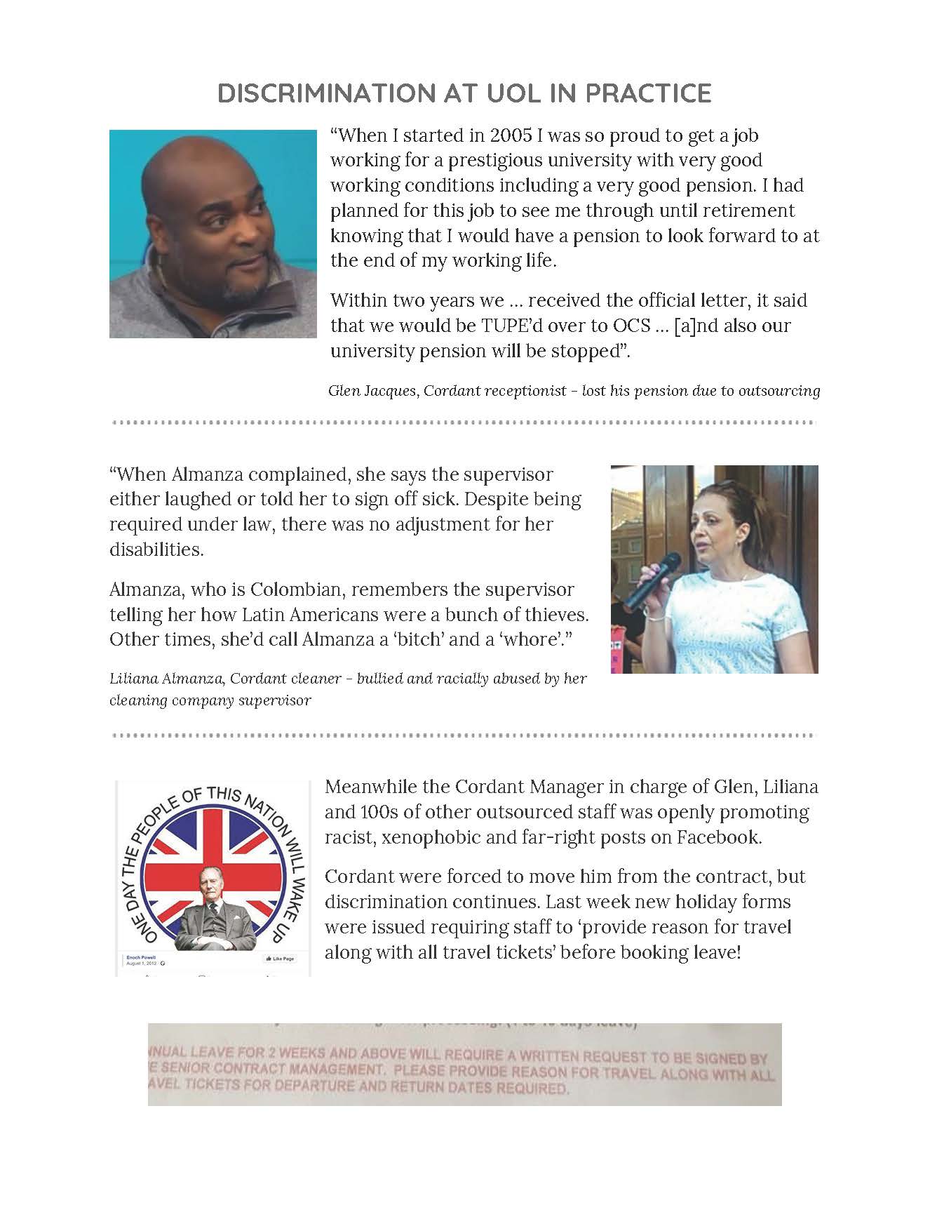 Currently, predominantly BME outsourced workers at the University suffer much worse terms and conditions than their mostly white directly employed counterparts. This is blatant discrimination and incompatible with the principles you outline.